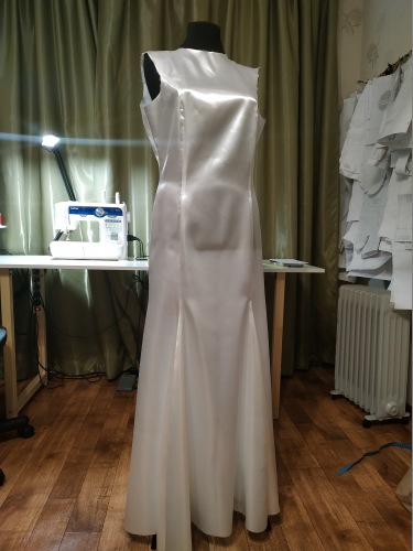 Я сшила пробник из тонкого дешевого атласа. Форму платье снизу не держит клинья некрасиво лежат фалдами.