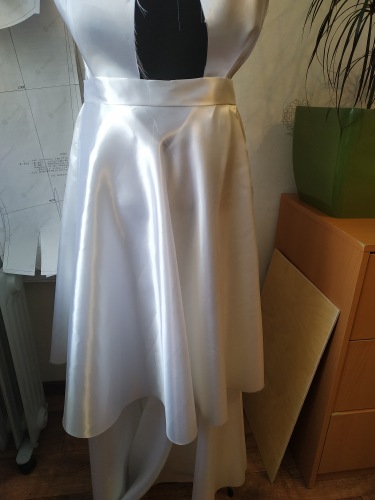 Имеем свадебное платье с юбкой А силуэта и шлейфом в метр, ткань микадо. Как обработать низ? Подвернуть? Боюсь будет плохо лежать, там же полусолнце по крою. Выкроить обтачку в 2 см шириной или шире? Длина по переду будет в пол (но не касаясь, чтоб юбка свободно висела).