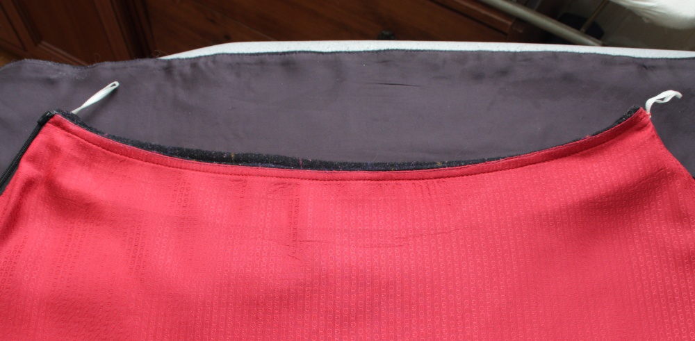 Юбка простая, два шва, без пояса, на красной подкладке и с подбоем:-)