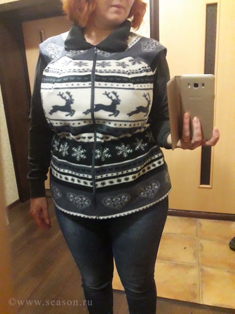 Муж заказал связать свитер с оленями. Ну оценивая свои временнЫе ресурсы, поняла, что он его получит лет через 5, не раньше, решила обойтись малой кровью и в один из набегов в тканевый магазин обнаружила чудесный флис с оленями. Купила нужное количество, а раскраивая его дома, поняла, что для подгонки рисунка его оказалось маловато, ширины ткани не хватило. Пришлось мне ехать докупать и перекраивать спинку. В результате осталось 2 шикарных выпада из ткани, которые пролежали в закормах несколько месяцев, не давая мне покоя. А тут пошел бум на утеплялки - жилетки и мое сердце руки дрогнули.
