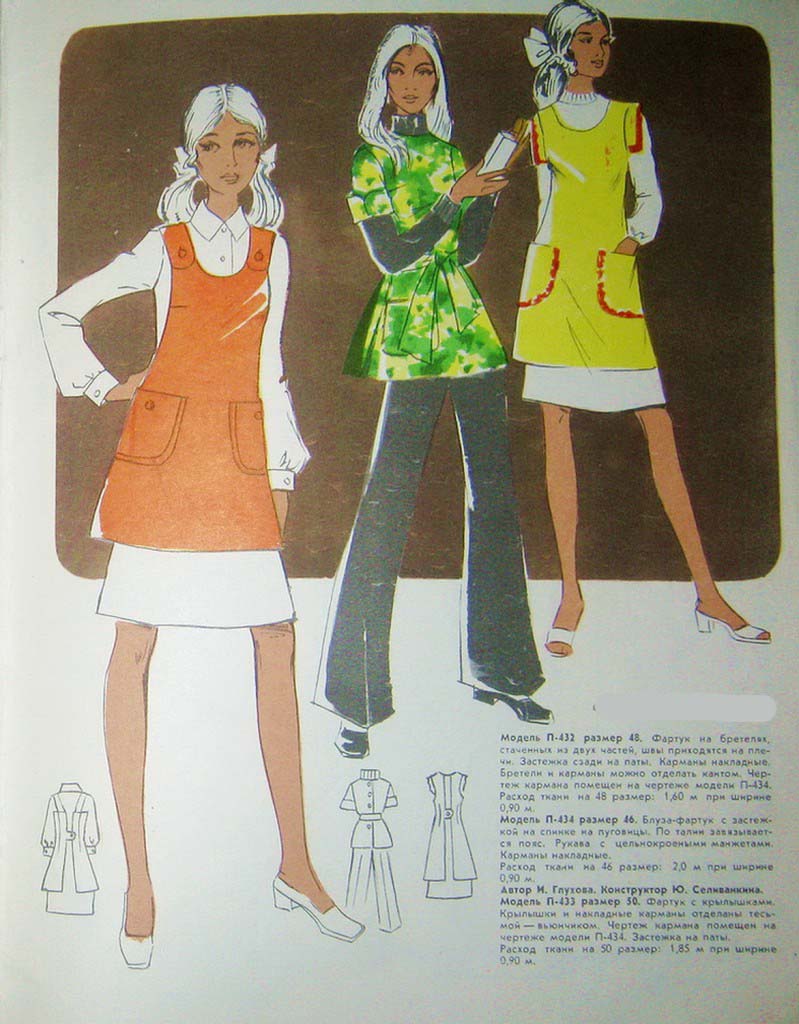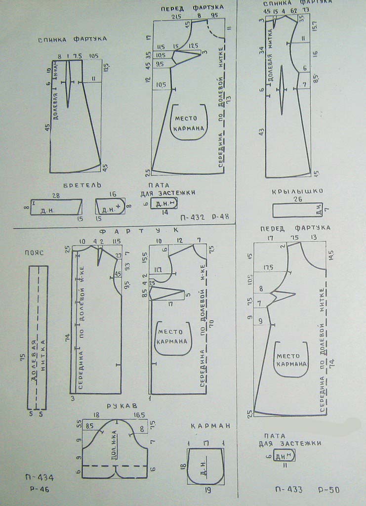 В подборке видно, что при узком силуэте фартука и карманам, несколько сдвинутым к бокам, накладные карманы будут удобны.