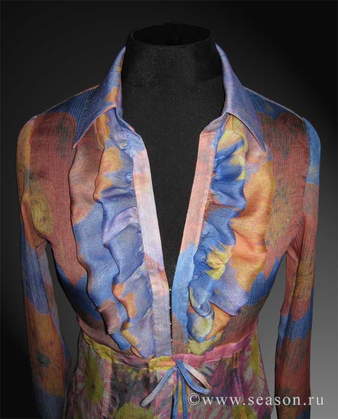 NIka Опубликовано 4 октября, 2009 Автор Поделиться #1133 Опубликовано 4 октября, 2009 Всем привет! Показываю блузу, которая всё-таки родилась.Материал - натуральный шелк, жатка напоминающая шифон, но двухслойная.Еще и вдобавок - купон.Идея заказчицы, я лишь молча воплощала, принимая с болью в сердце изменения по фасону на каждой примерке. Шилось без любви и радости, всё это съелось непониманием клиента - все её желания были в принципе неосуществимы из-за нарушений технологии изготовления.В конечном итоге я оказывалась права, это она отметила при окончательном виде изделия после всех переделок.Сначала шили как хотела она, потом это ей не нравилось и возвращались к моим предложениям, но всё надо было пороть и заново шить. Я думала, что бедная ткань не выдержит и рассыпется.Слова тяжело подобрать, это одни эмоции, которые не поддаются озвучке.Одно радует, что я её все-таки сделала и клиент ушла довольная и сияющая.Моя блуза сегодня улетает в Италию на выгул, там сейчас жарко :).Вот такая история, смотрите фото, задавайте вопросы, отвечу. Ссылка на сообщение Поделиться на другие сайты Поделиться