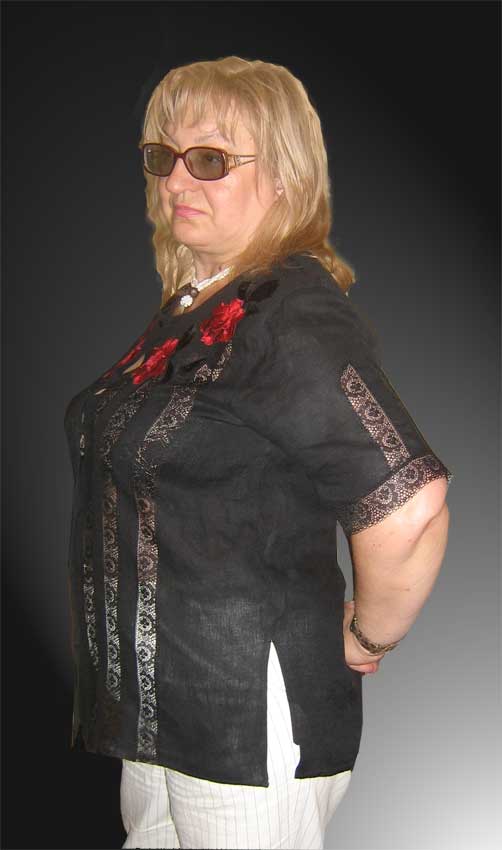 NIka Опубликовано 28 июня, 2008 Автор Поделиться #211 Опубликовано 28 июня, 2008 (изменено) Вот еще одна реставрация блузы. У дамы была любимая льняная блузка. Наступили жаркие деньки и дама о ней вспомнила, но увы, она была тесновата (в груди и бедрах не сходилась на 5-6 см).Решила за счет кружевных вставок добавить нехватающий объем. Чтобы смотрелось гармонично добавила кружева и в рукава. По бокам сделала разрезы, т.к. носить блузку будут поверх брюк. Ну и украсила вышивкой и заменила пуговицы на "Сваровски". Изменено 28 июня, 2008 пользователем NIka Ссылка на сообщение Поделиться на другие сайты Поделиться