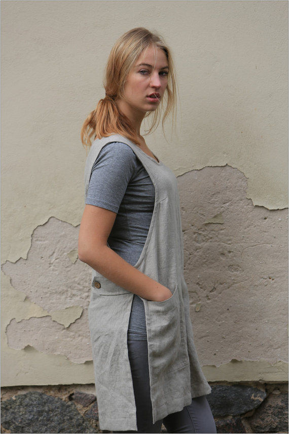 У этого фартука очень нравится силует, но ткань хочу однотонную, лен. Почему-то черный. Но черного льна дома нет. Есть темно-изумрудный и достаточно плотный. А еще хочется его на подкладке, чтобы скользил поверх одежды. И думаю, не слишком ли громоздко будет - плотный лен и на подкладке, и все это поверх одежды (готовлю чаще всего второпя не раздеваясь после прихода с работы) при +33 градусах?? :))