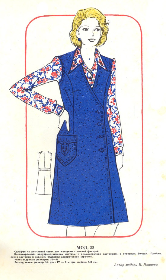 KateLaime Опубликовано 31 октября, 2018 Автор Поделиться #104 Опубликовано 31 октября, 2018 В качестве дневниково-размышлительной записи, и может кто подскажет. Клиент у меня хочет сарафан в таком духе. То есть должен быть вырез "уголком", возможно запАх, возможно запАх с разрезом. Длина за колено. Сарафан планирует носить в холодное время года. Сарафан планируется неотрезной по линии талии. С вытачками. Рельефы делать не хотелось бы, но если будет надо - сделаю. Клиент -дама в возрасте, полненькая, без талии, невысокая. Ткань - из советских времен, очень плотная, с рисунком "елочка", односторонняя (изнанка ворсистая, похожа на современный лис по ощущениям). Сама ткань скорее похожа на тонкий драп. Плюс - у нас планируется застежка на молнию в боковом шве, а по переду платья клиент хочет пустить отделочную полосу из черного атласа (тоже из наследия). Я пока скроила пробник, основываясь на модели с первого фото. То есть у меня получается сарафан с запАхом. И вот тут я застряла. В два слоя, как в классическом запахе эту ткань пускать не реально - будет толсто и некрасиво. А как сделать разрез - и убрать второй слой, чего -то не соображу. Может поиграться с вариантом как на втором фото? Или воообще по-другому надо? В общем как "поженить" V-образный вырез, разрез, возможно запАх или его имитацию, цельнокроеный силуэт и приткнуть вертикальную отделочную полосу из атласа (для стройности)? «Ангелы летают просто потому, что легко к себе относятся». Борис Гребенщиков Ссылка на сообщение Поделиться на другие сайты Поделиться