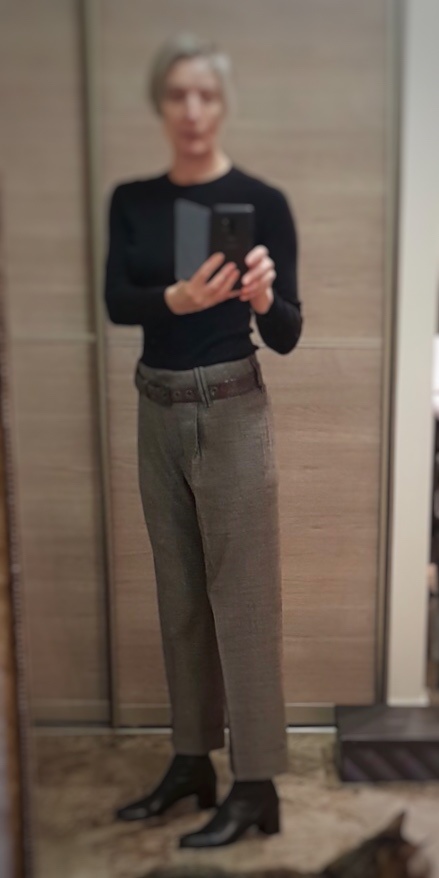 А вот у Корфиати классика - прекрасная. Но прямо классика. Там очень специфический средний шов, опущенную слонку из него не получалось моделировать совсем, я пыталась, получается чепуха. Странно, а у меня корфиати широкими получились вверху. Но она дает рекомендацию по ширине брюк внизу прямо как в конце 90х. Получаются такие классические брюки-сигареты. Они сами по себе хорошо садятся, но получаются совсем обычными.