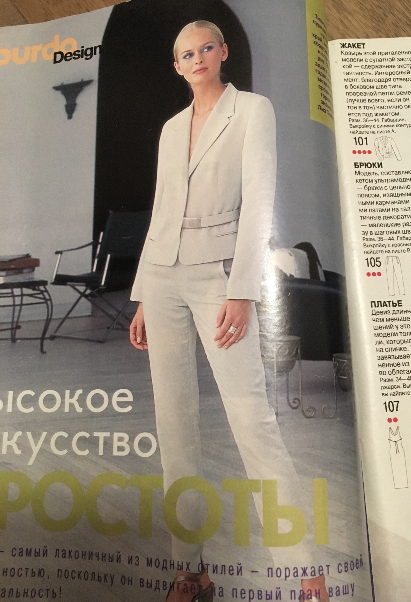 В общем, построила уже вторую вариацию брюк... Но все не то, не дается общий силуэт костюма((. При трезвой оценке, поняла, что двубортный жакет шить не буду - то, что нас украшает в размере 32- 34, вряд ли украсит в размере 36-38. Вот сколько смотрела - мало кого украсили двубортные зделия. И, памятуя о 90х, долго они в моде не держатся, а жакеты я не люблю часто шить.