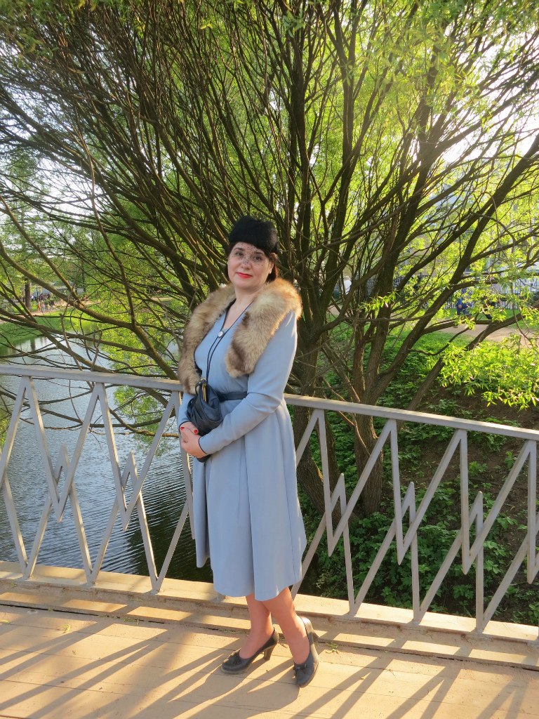 Hellina Опубликовано 4 апреля, 2019 Автор Поделиться #109 Опубликовано 4 апреля, 2019 (изменено) Я в стадии создания очередного комплекта для старшей группы. Уже наметила конкретику. Начала поиск тканей. А пока расскажу про мой роман с военными сороковыми.До того, как я начала интересоваться этой темой, представления о военной моде у меня были как у большинства. В соответствии с этими никакими представлениями я даже изготовила платье для танца, колхозное. Отрезное в талию, юбка солнце, с белым воротничком и манжетами и пояском. Фу! Мне стыдно, но, что было- то было.Потом стала интересоваться темой, и на волне этого интереса попала на показ мод соответствующего периода, организованный Мэган Виртанен. Там немного поприставала к барышням со всякими вопросами, и начала интересоваться дальше.И доинтересовалась до того, что решила поучаствовать в кастинге у Мэган на очередной показ к 9 мая.Из меня модель так себе. Решила шить на дочку, благо уже подросла к тому времени.Смотрела всякие выкройки, из тех, что у нас добрые люди выложили в соответствующей теме. Остановилась на одном платье, вроде не слишком сложного кроя, хоть и не без вопросов. Выкройка по лучевой системе.Как раз тряпочка нашлась- Вера, которая VeraPravda, откинула мне кусочек фиолетового крепа. Только на платье целиком маловато его было, поэтому пришлось искать компаньон. Нашла вискозу, отлично вписавшуюся в проект. Ибо вот такое сочетание однотона с цветочной тканью было крайне характерно для того времени. Достаточно внимательно просмотреть фильмы военного времени.Но, сразу резать тряпочку не решилась, сперва потренировалась на котах на чём было, чего не жалко. Правильно сделала. Размерчик оказался великоват, хотя рисовала со тщанием.В пробный вариант я влезла! Хоть и с мылом.Поэтому с поправками скроила фиолетовый креп с вискозой. Подплечников делать не стала. У дочки плечи сами по себе имеются, а тут ещё фасончик такой, что не очень понятно куда их. Просто укрепила флизелином плечевую область- и всё.К платью подобрали поясок из имеющихся. Тёмно синий. Пуговки вполне себе винтажные, в виде цветочков. Нашлось в закромах ровно нужное количество. Причём они какого-то такого цвета, коричневатого. но при этом очень подошли к месту.Сумочку свистнули у моей тётушки. Со шляпкой тоже вышло интересно. Когда-то сильно давно цапнула на раскладушках на удельной за копейки какую-то непонятную соломенную шляпку, нуждавшуюся в починке. Зачем- не помню! Ну и лежала она себе. А тут извлекла её из запасников, и реанимировала под насущные нужды. Там середина текстильная была. Её ликвидировала, соединила соломенные части, и место соединения весьма кстати закамуфлировала ленточкой из плательной ткани. Теперь о причёске. Это не менее важная деталь, чем все остальные. Пришлось и тут изучать матчасть. В итоге, накрутила, как могла киндебоберов с помощью шпилек и невидимок, и сверху на это нахлобучила шляпку, закрепив её шпильками.Туфли нашли визуально подходящие "по эпохе". И вуаля!Сфотографировали образ и получили одобрение Мэган.Тот показ состоялся у здания РНБ на Московском. С погодой, как всегда, не повезло, был дождь и нежарко, но девушки мужественно преодолели превратности погоды и дефиле было на уровне. Тем более, что к началу дождь всё же соизволил прекратиться.На себя я, после долгих размышлений, тоже пошила 