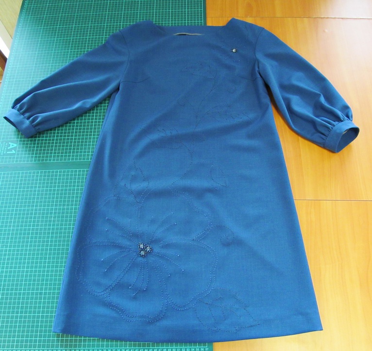 СергеЕва Опубликовано 11 марта, 2019 Автор Поделиться #69 Опубликовано 11 марта, 2019 (изменено) Платье для очень подвижной девушки. А-силуэт, вырез - слегка скруглённая "лодочка", плечо спущено на 2 см, рукав 3/4 с рубашечным окатом и сборкой по шву притачивания манжеты. По переду ручная "пунктирная" вышивка и расшивка бисером и бусинками. Все срезы окантованы, низ платья и манжеты подшиты вручную. Застёжек нет. продолжение следует... Изменено 11 марта, 2019 пользователем СергеЕва "Разница между стилем и модой - в качестве." (Джорджио Армани) Ссылка на сообщение Поделиться на другие сайты Поделиться