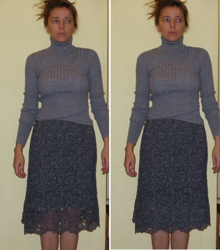 Мне подарили шерстяное кружево очень подходящего цвета, и я попробовала сделать из него юбку. Итальянской выкройка прямой юбки с эффетком высоких бедер. У меня 2 юбки по этой выкройке, но правда из жестких тканей, прелестно сидят. Я добавила с небольшое клешением годе по бокам, чтоб придать юбке подвижность а себе свободу шага, наколкой определив наилучшую его ширину и высоту.