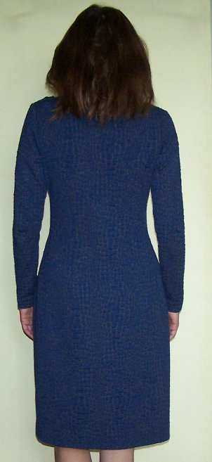 Я его поподгоняла на себя, от этого талия у него опустилась на место , складки под грудью, что были почти у линии середины переда, разошлись вбок на обычные места, на спинке возникли талиевые вытачки, платье утратило веселость и стало отдавать 40-ми.
