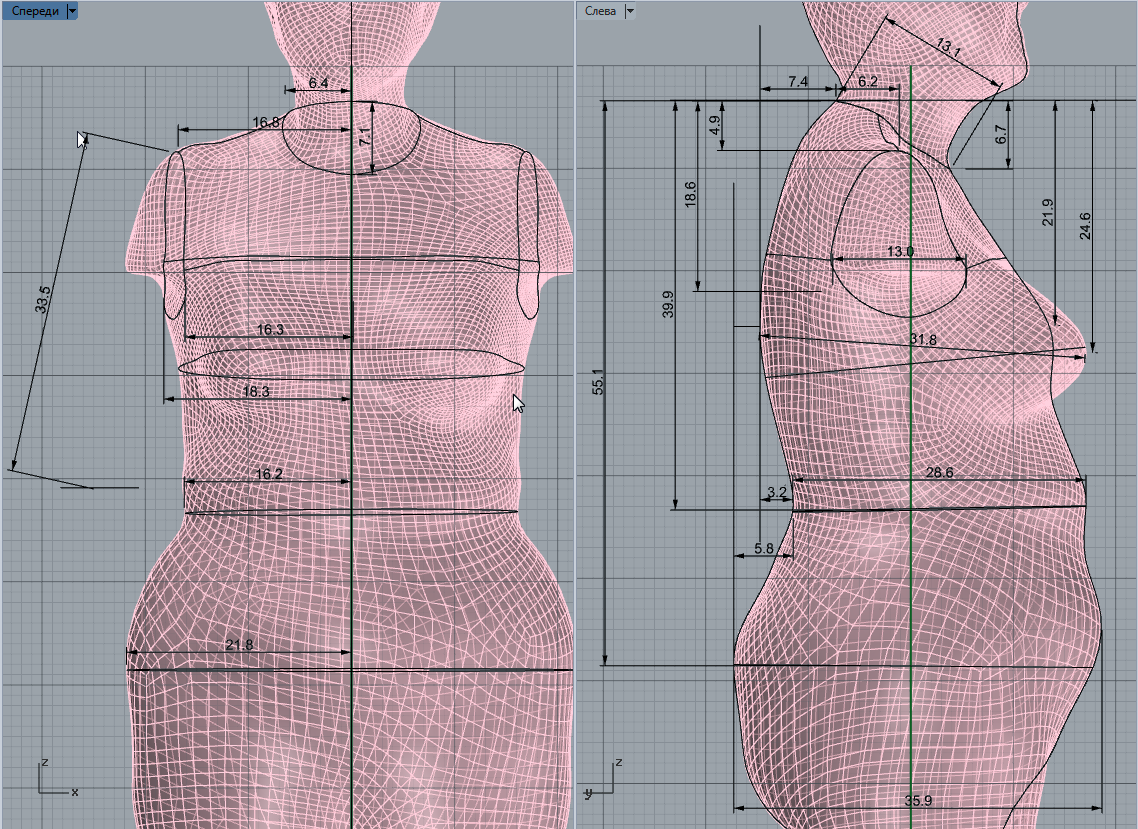 arhimed Опубликовано 10 апреля, 2019 Поделиться #447 Опубликовано 10 апреля, 2019 ждем пояснений от Архимеда...Загружая данные в Стаприм, если верить авторам, мы получаем 3Д манекен (зелененький). Насколько он точен мы можем увидеть в окне 3Д. Сравнивая с скрином скана из Рино - это все видно. Даже можно измерить куда какой размер "убежал". Можно поправить, подогнать радиусы изгибов, подтянуть где нужно.Надеюсь эту часть все уже понимают. И прежде, чем говорить что либо дальше, меня интересует.А надо ли так исправлять? Ведь всетаки есть вероятность, что то, что мы видим в 3Д окне - это нечто не то, что на самом деле. Просто красивая "визуализация".А может от такой поправки будет только хуже? Если это обманка, то и смысла нет по этим видам спереди и сбоку (а кроме того и изометрию желательно видеть) строить линии в 3Д - я заранее распинаться не собираюсь. То, что метод создания лекал с помощью 3Д работает, мы видим реально. Пока это в Рино (почти вручную) и в Луке (почти автоматически, но не с космической точностью). Измерено и перемерено не один раз... Ссылка на сообщение Поделиться на другие сайты Поделиться
