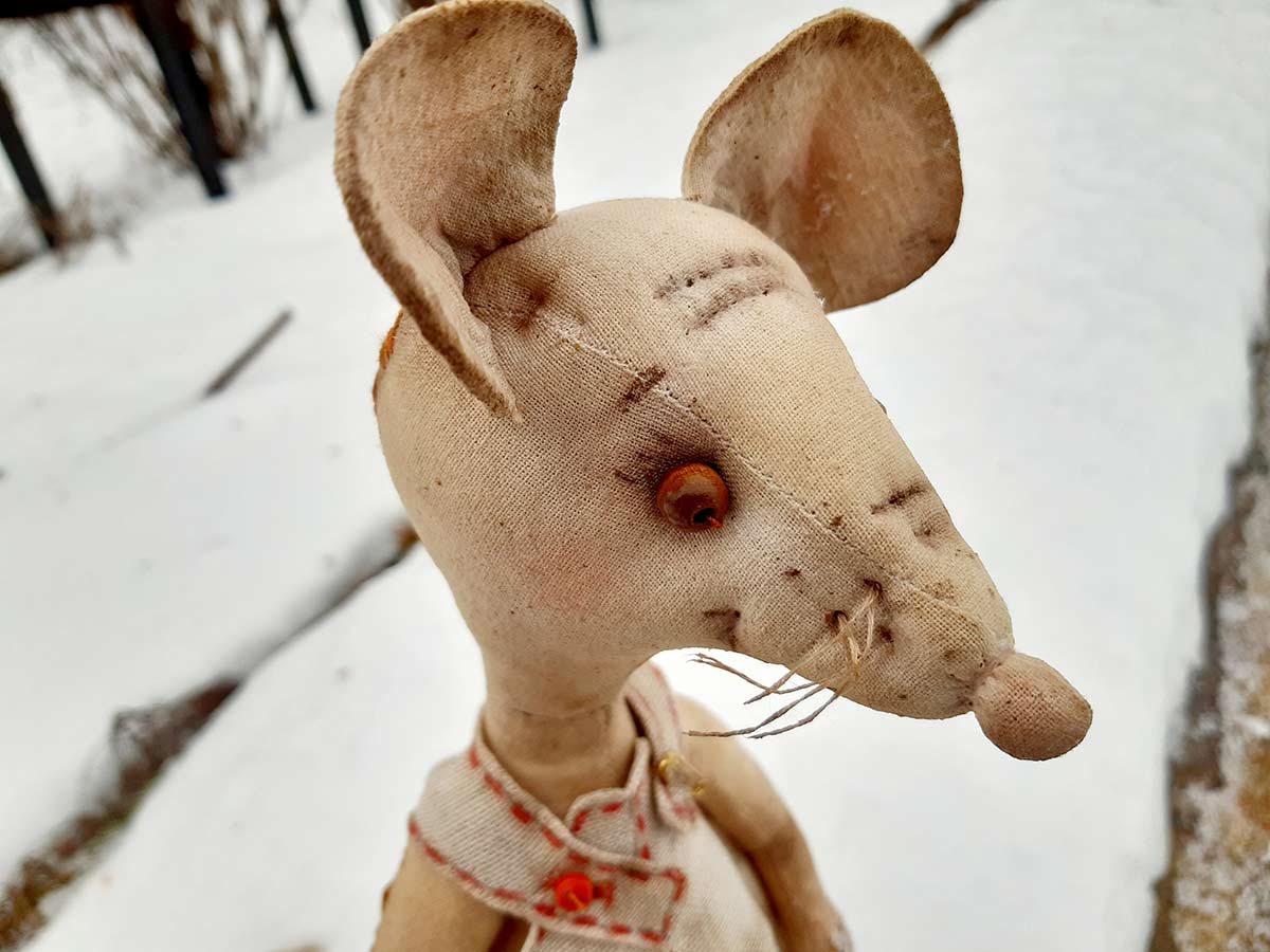 Вообще, она задумывалась как совершенно простенькая мышка сшить-набить-одеть в одежки, оставшиеся от предыдущих проектов, добавить на выбор давно сплетенную из джута корзинку или сумочку. Но обойтись малой кровью не получилось, девушка оказалась разборчивой особой.