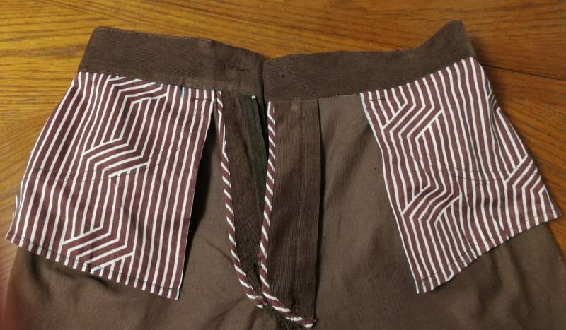Карманы на полочках брюк. Без изысков. Просто и прочно. Визуально выглядит не очень, потому, что я карманы зашила на машинке, чтоб не мешали, собрала гульфик. На спинке карманы пришила .