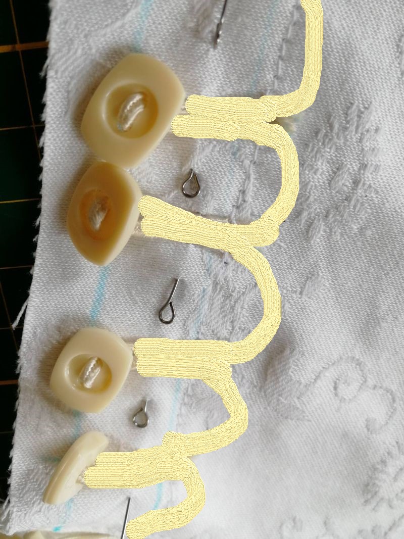 Нанизываем пуговицы на ленту или плотную тесьму, прикалываем на равном расстоянии от края по разметке. Ленту/тесьму не разрезаем (вот тут была моя ошибка, хнык...) Прошиваем ленту на растоянии 1-2 мм от линии пришива пуговиц.