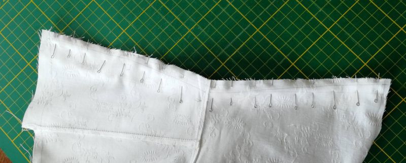 Накладываем будущую застёжку на боковую часть с лицевой стороны, прикалываем булавками, прошиваем с изнанки грации.