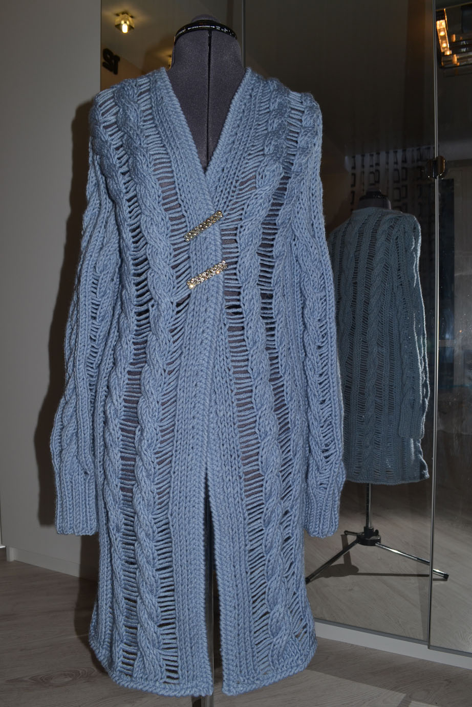 Перевязывала головку рукава,пояс связан полой резинкой.Долго,но мне нравится,я люблю утянуться потуже.Я это изделие считаю уместным для прохладного лета,представляю себе его надетым на шёлковое платье.Под пальто вряд ли получится,посмотрим.Может иногда в гости,посидеть у подруги на кухне-))