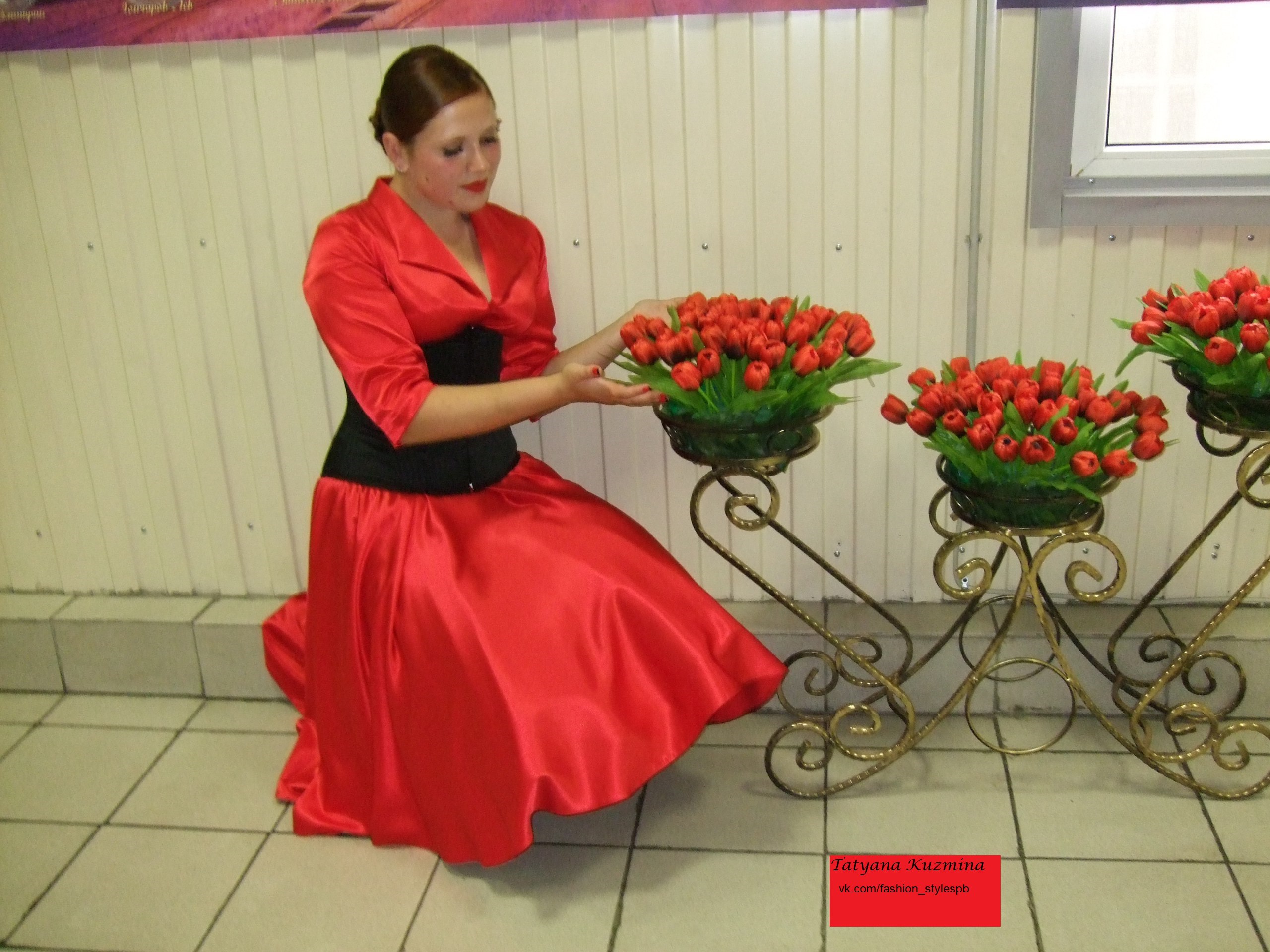 Здесь использовали красную юбку, корсет и черный кружевной верх.