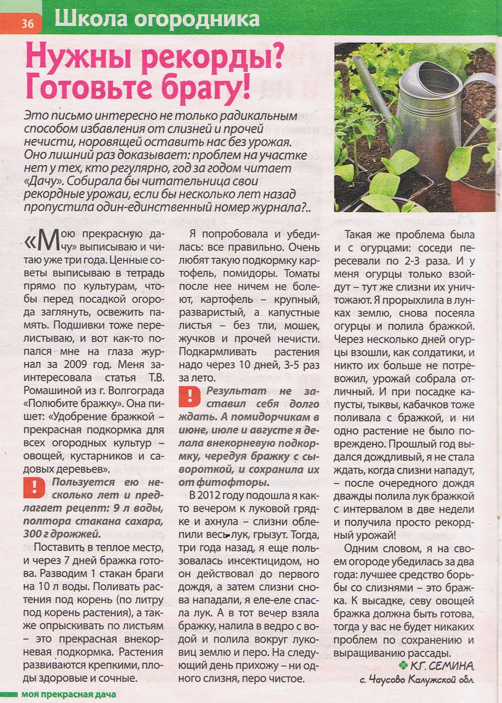 Rain Опубликовано 28 декабря, 2014 Поделиться #106 Опубликовано 28 декабря, 2014 (изменено) Rain, спасибо огромное, обалдеть. Вопросик, а сухие дрожжи можно? У нас нету "живых", увы. Насчет сухих дрожжей не знаю, буду писать в редакцию просить уточнить количество дрожжей, заодно спрошу и про сухие. Мне опытная соседка сразу сказала, что дрожжей для браги мало, попробовала сделать по рецепту - действительно, почти не бродило. Потом отвлеклась и забыла, спасибо за напоминание. Мы прям сейчас в праздники наконец-то делаем наш первый серьёзный огород.Там у меня будут жить: помидоры, огурцы, баклажаны, сладкий перец, окра, кивано, зелень для салата.Рассада моя уже просится в ОГ вовсю. Будут у меня все овощи жить в раме размером 2,4 на 6 метров, со врененем может подниму до высоты гринхауса, но пока только рама. Огурцы хочу пустить вертикально, чтоб место не занимали на земле. Для огурцов можно сделать кулису из кукурузы с северной стороны, они хорошо с ней уживаются, с салатом и укропом тоже. Во вторник земельку привезут и буду всех засаживать. Жду-не-дождусь. А достаточно ли будет бражко-удобрения с попугаечного помета? ))) Или он строго куриный должен быть? Хочется органик, конечно же. Думаю, можно и попугаичий, только следить за концентрацией, разводить до бледно -голубоватого цвета раствора, как голубиный. И еще. А это правда, что на след. год помидоры на старое место, где росли помидоры не сажают? Не помню откуда это у меня, но где-то читала. Лучше, конечно, менять места посадок, но у меня растут в стационарной теплице, так что по возможности только меняю верхний слой грунта, к тому же у нас промораживается земля, это помогает справляться с накоплением болезней.И ещё. ) А должен ли быть какой порядок в посадке? К примеру балкажанчеги с помидорками. Огурцы ещё c кем нибудь. Или не обязательно? Из камней сделаю островки, чтоб по ним внутри передвигаться. Не хотела два метровой ширины. Хотела один и большой. Совместимость растений надо соблюдать и очередность посадок тоже, т.е. нельзя сажать помидоры после картофеля и т.д., но это тема большая, надо смотреть литературу. Rain, хотела спросить, я совсем далека от выращивания винограда, но у нас есть 2 куста белого, виноград каждый год мелкий и кислый. Я только листья на долму и пользую. Хочется добиться результата, то бишь сладкости какими-нить упрощенными методами. Возможно ли? Или нет. Кусты не молодые, но и не старые. Думаю им лет 12-15. Если сорт кислый, то сладким его просто так не сделать, можно перепривить, но я пока виноград не прививала, там есть свои тонкости, можно пустить на вино или уксус (я тут посмотрела на днях, сколько бутылочка виноградного уксуса стоит..., есть смысл). Zvezdopad, спасибо за бутылку. Первый раз о таком способе читаю. Изменено 28 декабря, 2014 пользователем Rain Ссылка на сообщение Поделиться на другие сайты Поделиться