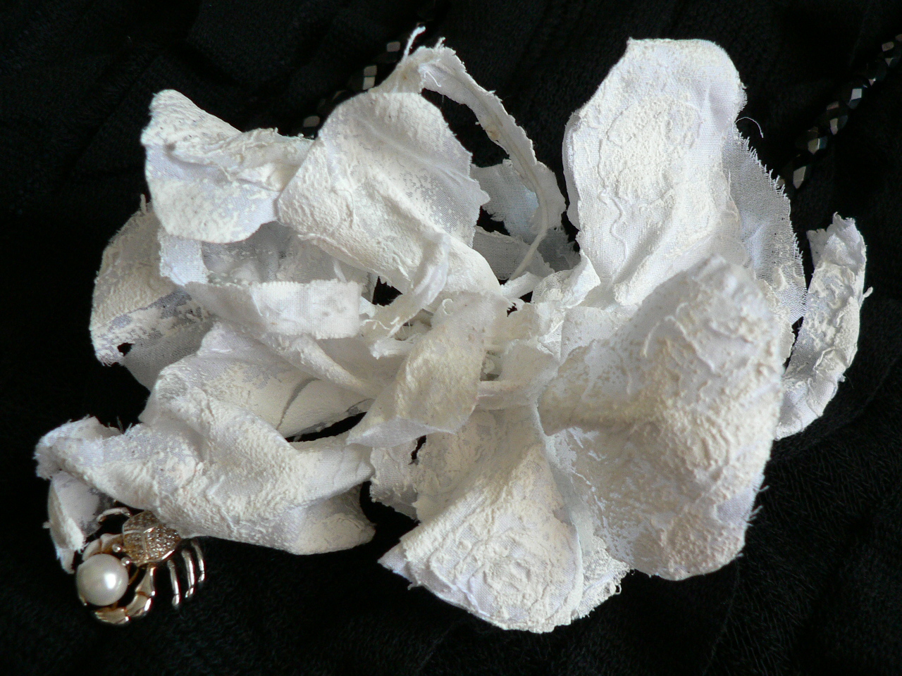 Amanta Opus Опубликовано 2 ноября, 2010 Поделиться #1517 Опубликовано 2 ноября, 2010 (изменено) а поучиться то у Вас есть чему.....)именно чувству ткани, и как из неё выжимать))))) хотя... моё мнение-это природой дано, как обоняние и осязание ....либо могЁшь либо нет)Уверена, что всё это можно развить:)При условии... если думать и не лениться:)Этот цветок уже своё "отжил"....захотелось аксессуар к чёрно-белому гардеробу...захотелось сделать очень страшненький нецветок (как Женечка точно подметила, лучше не придумаешь, даже талантливее не придумаешь ассоциацию:) Обожаю её за этот дар!) Так вот, гардероб состоял (пишу в пошедшем времени, потому как почти уверена, что не вернусь к нему в будущем сезоне...поиграла и ...с молотка) из нескольких комплектов и в каждом он нёс свой смысл...акцент, пятно, которое притягивало взор....знаете ли от сглаза помогает...:)))) Сделан за пару часов из шёлка ламинированного какой-то резиновой краской:) Хотелось, чтобы он был похож на тех, кто с клешнями:))) Жуть, но я его любила и была счастлива, когда его носила:) Изменено 2 ноября, 2010 пользователем Amanta Opus Ссылка на сообщение Поделиться на другие сайты Поделиться