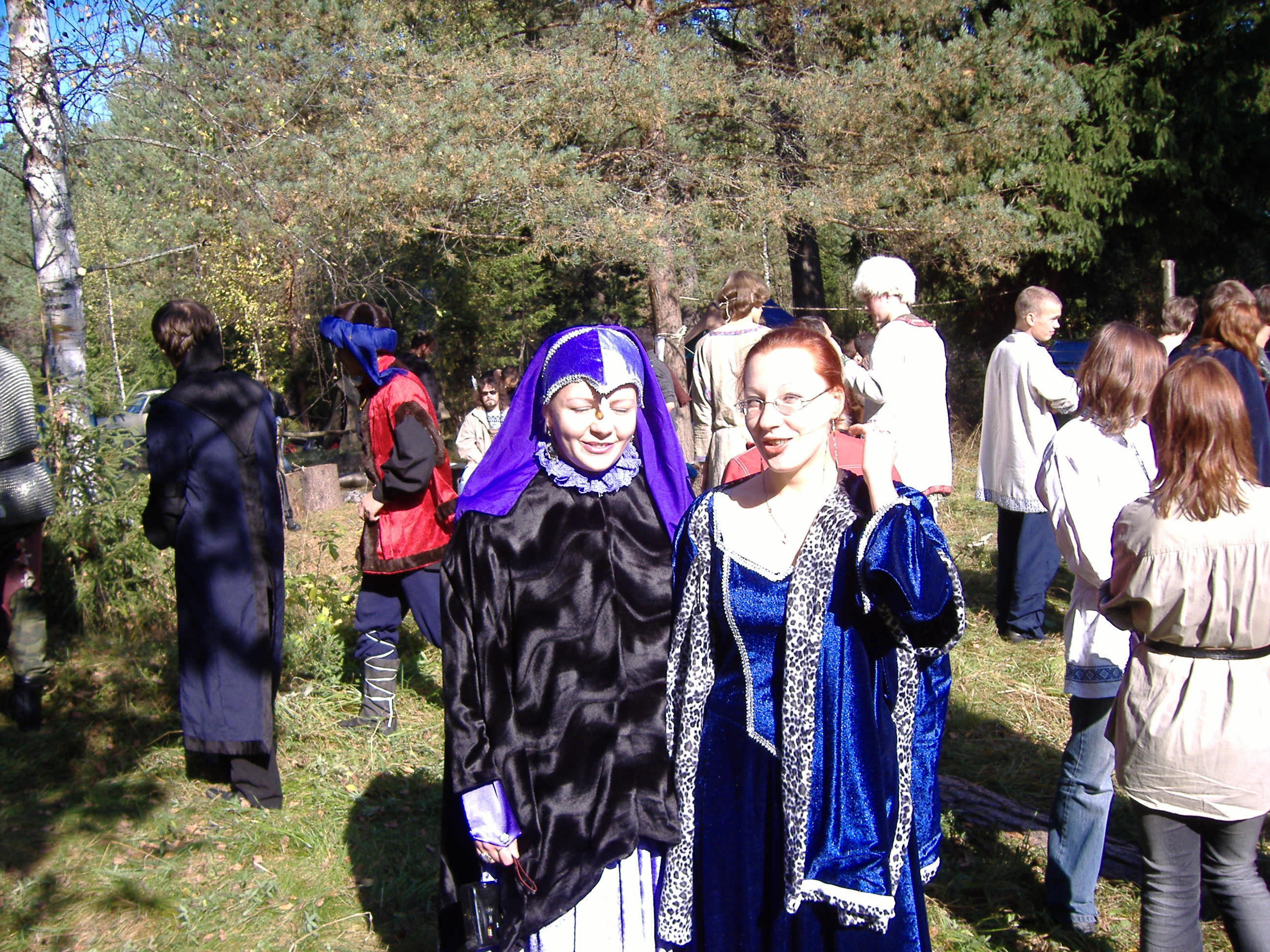 На первых двух фото - Осенний фестиваль 2005 г. Оба платья шила сама (на заднем плане спины двух парней - то же мои). Героини не акцентированы - просто чтоб красиво было, вольная фантазия на тему средневековья и фэнтези. На последней фотографии,те, кто в черно-красном - мастерская команда. Игра - Робин Гуд-2006. Это форма у нас была в клубе такая. У парней черно-красные рубахи, черные штаны и еще черно красные большие плащи (на фото их нет). У девушек - черные рубахи, черные юбки, красные корсеты, черно-красные плащики и черные головные накидки. Город - Иваново. Девушки в платьях - не из клуба, вольные кабатчицы.