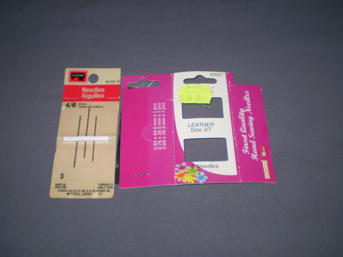 Я прошлась по магазинам, оказывается иголок для кожи выпускает много фирм, хотя Prim не нашла. Сказали , что бывает, но пока нет....Больше всего меня поразили цены- купила 3 иголки за 2 доллара, 5 иголок за 1 евро и 100 ИГОЛОК ЗА 1 дОЛЛАР. Иголок у меня теперь, как гуталина у кота Матроскина. Заточка у всех разная, но особой разницы не заметила, не лучше, чем хорошей тонкой и острой иглой.Кроме того, они короткие, а подшивать ткань или пришивать пуговицы удобно более длинной иглой.. Но буду искать Prim, они у нас по 1 евро за штуку, говорят, а то пальцы уже немеют.