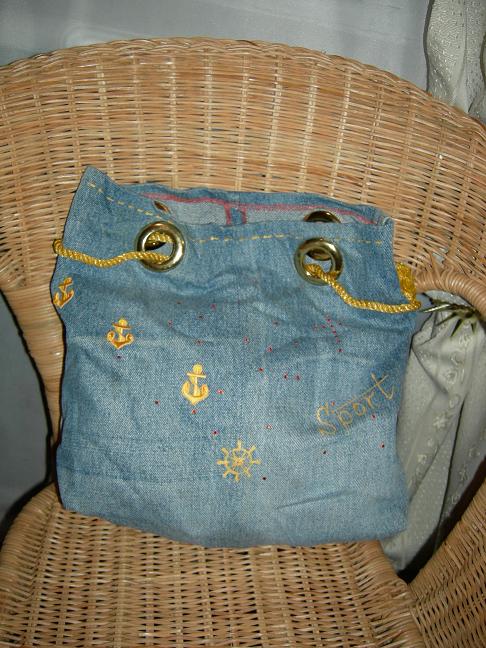 Е.С. Опубликовано 26 ноября, 2007 Поделиться #9 Опубликовано 26 ноября, 2007 Это вам, Т.В., спасибо за терпение. пришивалось именно так!А вот и моя сумка для занятий спортом, извиняюсь, что не глаженная - фото было снято сразу после стирки и сушки :).Сумка была сшита из остатков старых джинсовых брюк. Выкроена трапецией, углы внизу срезаны и зашиты, чтоб получилось дно, правда оно ничем ни укреплено. Оранжевые точки - это клеевые стразы, якоря преклеены, а штурвал надпись нарисованы краской по ткани. Кольца - люверсы для штор, а ручки сделаны из шнура. Ссылка на сообщение Поделиться на другие сайты Поделиться