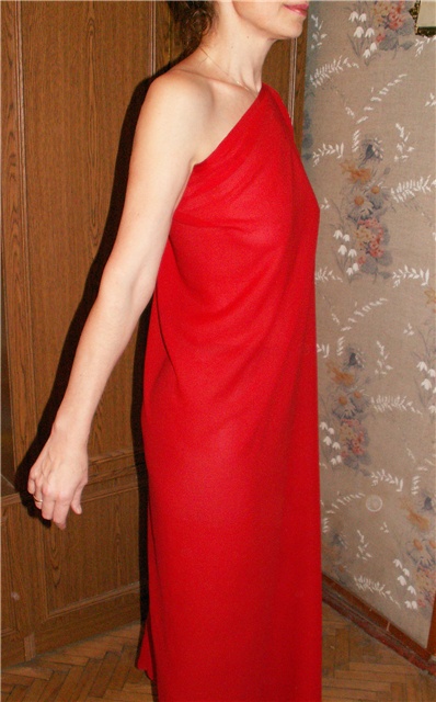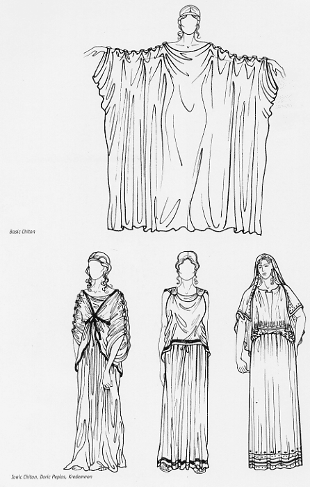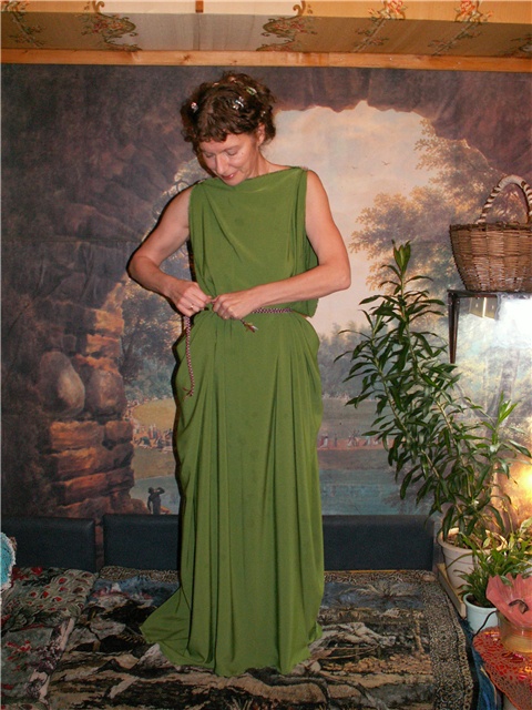 Бурлакова Фрося Опубликовано 4 декабря, 2007 Поделиться #1 Опубликовано 4 декабря, 2007 Приветствую сообщество. ======================= ...Ну ваще-то, мой гардеробчик состоит из бесконечного числа нарядов Х-силуэта (варианты: лиф в рюмочку и юбка - или кринолин или тюльпан). Ну есть, конечно, в стиле 20-х, есть в стиле 10-х, есть ампир, есть реформ, есть А, есть фольклор, есть 60-ые, есть "маленькая мама", есть творческое (надеюсь) переосмысление практически всех исторических стилей, есть... практически всё кроме брюк... И есть - Хитоны. Прямой силуэт?... спрятанная талия?... вялые крепдешины и крепжоржеты? - казалось бы, всё настолько не моё... - Когда-то я по уши влюбилась в этот крой. С тех пор я не раз шила хитоны. Вот и сейчас у меня дома есть штук 7-8. Есть ещё и на даче, там особенный, собственноручно гофрированный. Из наличных 1 репетиционный (я в нём танцую), 1 нарядный (городской наряд для лета), 1 демонстрационный (специально сляпанный для того, чтобы кое-что продемонстрировать здесь), 1 проектируемый (его я сошью по мере создания этих заметок, чтобы показать ещё некоторые приёмы), штуки 4-5 костюмные (сценические костюмы муз для одной моей постановки под названием Парнас). =================================== Хитоны...Первые попытки шьющего человечества приладить кусок ткани к человеческому телу. Мешок с тремя дырками - так решили эту проблему египтянки. Тонкий белый лён, широкий пояс, на вид - вроде кимоно "летучая мышь" с рукавами 1/2. Т-образная облегающая тело кофточка до талии или слегка выше, весьма современного вида, похожая на болеро - это решение критянок. А гречанки решили - по-своему. И создали - Хитон. ==================================== В сущности, хитон делается из 2-х одинаковых прямоугольных кусков ткани шириной от 80 до 150 см и длиной от 150 до 200 см каждый.Они зашиваются в трубу, и эта труба определённым образом устраивается на теле с помощью застёжек-фибул. - Можно, впрочем, ничего не застёгивать, а раз и навсегда скрепить в нескольких местах. ...Но всё это так ловко, так гениально придумано и приспособлено к женскому телу и его пропорциям, что получается упоительно красиво. И до сих пор я не перестаю удивляться, как, буквально одним движением руки, скучный кусок ткани превращается... превращается... Но конкретно - чуть позже. Ткань гречанки брали - тонкую шерсть, потом тонкий лён, потом тонкие шелка.В Греции любили палевые тона, но были и яркие.Позже научились делать узорную кайму со знаменитыми греческими орнаментами, любили ткани в редкий горошек или так же редко рассыпанные по палевому полю какие-нибудь мелкие загогулины. Мне много раз встречалось утверждение, что исторический хитон изготовлялся из одного цельного купона, как правило, вытканного самой будущей хозяйкой платья. - По-моему, несусветная глупость, которую один автор переписывает у другого. При ручном ткачестве оптимальная ширина полотна - 35-40 см, это определяется размахом рук человека и необходимостью перекладывать челнок из одной руки в другую. - Некоторые предполагают, что на станке работало 2-3 ткача одновременно, и челнок (соответственно, ширина полотна) мог быть больше... Не берусь судить. Но как правило, все древние крои (русская рубаха, кимоно, кельтская туника...) исходят из ширины полотна именно в 35-40 см, именно под такую ширину приспособлены все детали кроя. Думается, и с хитоном было так же. =========================================== Существуют два вари