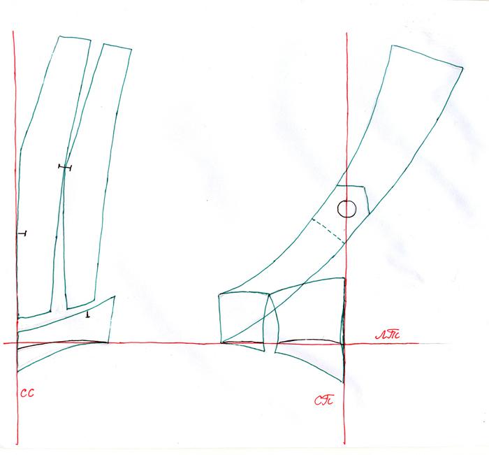 Бурлакова Фрося Опубликовано 9 января, 2008 Автор Поделиться #98 Опубликовано 9 января, 2008 Охотно поясняю. Шнип - это по-немецки значит клюв.А в крое так называется уголок лифа (иногда овал или прямоугольник), расположенный ниже линии талии спереди и сзади.Его форма и глубина типична для моды разных времён. Сантюр - это долевая полоска шириной 2-4 см, которая крепится разными способами к изнанке лифа (или к дублюру, или к подкладке) от линии талии вверх. Она плотно обхватывает и слегка затягивает талию, вроде внутренний плотный поясок такой, но сверху его не видно, остаётся иллюзия свободной верхней ткани.На самом деле даже при ширине 2 см эта полоска должна быть не линейная, а слегка выпуклая сверху. Для достижения точной формы она надрезается снизу поперёк см через 4-5, оставляя 1 мм неразрезанным по верхнему краю. И с помощью накладывания разрезиков при пришиве формируется точно по форме тела. =========================== "Тончайшая талия"... возможно...Но ведь стройности - много не бывает...И я редко упускаю возможность её себе - добавить. С помощью портновского искусства - в той мере, в которой я им владею.Поделюсь некоторыми своими секретами на примере этого нарядца. - Типа Дедушкой Морозом :):):) Итак, чево мы тута хитрили?... 1. Всё познаётся в сравнении. И по закону контраста, талия всегда подсознательно сравнивается с бёдрами. Бёдра здесь расширены кроем юбки, поэтому талия по контрасту выглядит таким то-оненьким стебелёчком, воткнутым в вазу. Поддержим неосознанную ассоциацияю многочисленными оборками-лепестками верха блузок :)...:). 2. Боковые швы пояса, как я уже писала, смещены вперёд на пару см.Общее количество слоёв ткани там - 11, а там, где бретели входят своими краевыми швами - даже 14. Это вполне реальная толщина порядка 0,4 - 0,5 см с каждого боку, поэтому её оттудова лучше убрать, иначе будет отсвечивать :). 3. Теперь сам крой верха. Вот он. Это на контуре моей фигуры. Взглянем на спинку.Горизонтальную линию талии заменим небольшим шнипом.Верх пояса оформим уголком, но более острым, чем низ.Результат: взгляд концентрируется в центре, талия выглядит уже и стройней. Проведём линии длинных вертикальных пройм, отступив пару см внутрь от визуальной линии бока.Результат: спина выглядит стройнее, уже, и длиннее. Поддержим эти эффекты наклонными линиями рельефов и выреза. Для наглядности - справа контур фигуры "без ничего". Он выглядит куда более грузным и даже других пропорций. 4. Взглянем на перед.Горизонтальную линии талии также заменим острым уголком шнипа. Это притягивает взгляд к центру и визуально зауживает талию. Проведём линии бретелей так, чтобы они частично с боков перекрывали пояс.Результат: плоскость пояса разбита и за талию начинает визуально "отвечать" только средняя часть пояса, что ещё добавляет стройности. Верхнюю линию пояса слегка выпукло скруглим, придадим ей лёгкое движение. Оставим под скрещением бретелей небольшой уголок для выглядывания блузки, он подчеркнёт хрупкость этого места. Поддержим ритм линий мягкими диагоналями бретелей. Плечо сократим (как и на спинке) на пару см. Теперь можно снова перевести взгляд на фигуру "без ничего" и убедиться, что стройности добавилось. Шнипы не только придают остроту, динамику и стройность линии талии, но и отводят от талии вниз грубоватый шов соединения лифа с юбкой, оставляя в неприкосновенности "самое уз