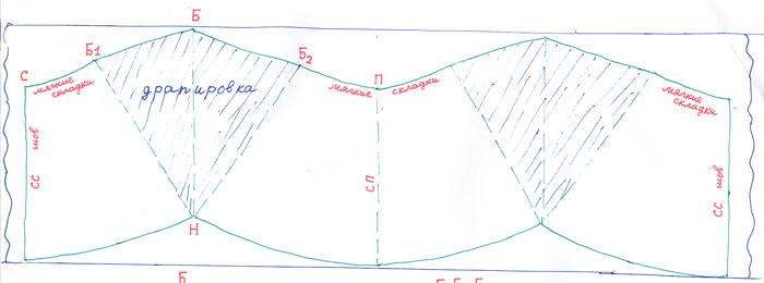 Бурлакова Фрося Опубликовано 10 января, 2008 Автор Поделиться #100 Опубликовано 10 января, 2008 Итак, о самой юбочке. Частенько слово "драпировка" употребляется для обозначения свободных незашитых складок.Те. деталь разводится на складки, они удерживаются швом и при необходимости прикрепляются на подклад. Настоящая драпировка, которую я называю античной, образуется без какого-либо разведения на складки, а просто... ткань надо прихватить в одной точке, а избытку ткани надо дать свободно упасть и не мучить его:):):).Я бы сказала, что навык создания таких драпировок - дело довольно хитрое и требующее определённой смышлёности. Пч. этот приём в современном крое практически не используется, хотя он очень красивый... Начнём с исходного варианта. В своё время, пытаясь это сконструировать, я "разводила складки" и так и сяк... Пока меня не просветлило:)Выкройка этой юбы выглядит так. Берётся достаточно сильно конически и прямо разведённая основа (верх СБ1 и Б2П закладывается под пояс мягкими складками, пышность по вкусу). Б2Н - исходная линия бока переда.Б1Н - исходная линия бока спинки.Заштрихованная часть Б1ББ2Н предназначена для драпировки. Для красивой формы угол БНБ2 дб. примерно 55-60 градусов. Шьётся это так.Зашивается шов спинки.Складываем по линии БН и зашиваем конверт для драпировки, соединив точки Б1 и Б2, шов идёт к точке Б. Дальше складки под пояс, это понятно.А затем закладываем конверт (мне это оригами напоминает).Для этого точку Б прикрепляем незаметно (или декоративно) к соединённым точкам бока Б1 и Б2. Конверт укладывается свободно падающей драпировкой с очень красивым волнистым краем и складками вниз от точки Б. Шов от Б к Б1-Б2 находится внутри конверта, совершенно незаметен и не мешает ткани красиво падать. Шьётся это совершенно элементарно, быстрее прямой юбки, но выглядит очень шикарно. Теперь о моей юбочке, представленной выше. Всегда всех стройней, розовее и вышеРучное шитьё в режиме онлайн Ссылка на сообщение Поделиться на другие сайты Поделиться