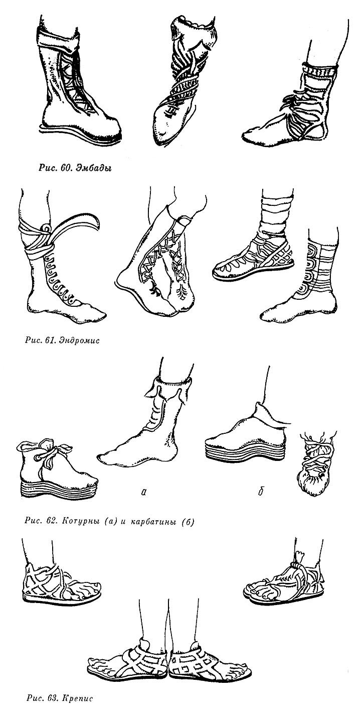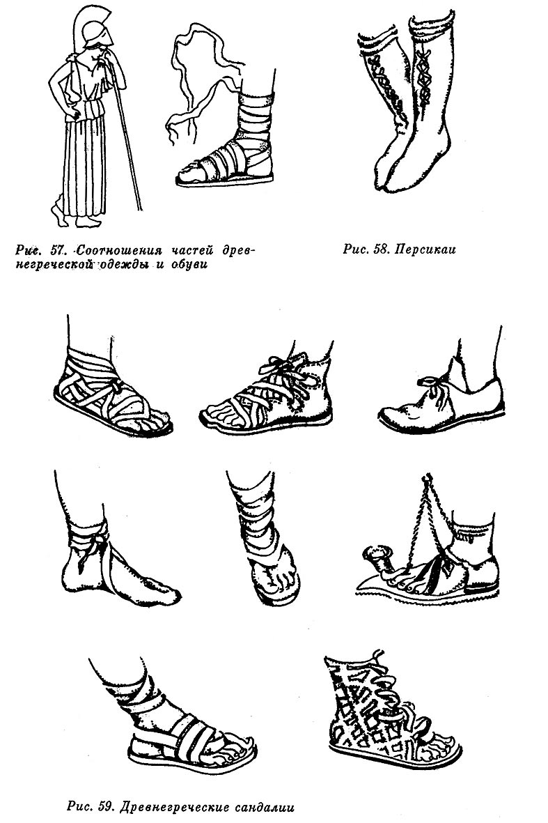 Gecuba Опубликовано 21 декабря, 2007 Поделиться #84 Опубликовано 21 декабря, 2007 Для полной коллекции добавлю еще обувь: ДРЕВНЕГРЕЧЕСКАЯ ОБУВЬ (XI—I вв. до н. э.)В пределах хронологических рамок развития, собственно древнегреческого искусства (XI—I вв.) различают несколько периодов: гомеровский (XI— VIII вв. до н. э.), архаики (VII—VI вв. до н. э.), классики (V—IV вв. до н. э.), эллинизма (IV—I. вв. до н. э.). Наибольшего расцвета греческое искусство достигло в период классики, в период расцвета рабовладельческой демократии. Хотя творчество греков во многом основано на наивных мифологических представлениях, оно не противостоит реальной жизни, проникнуто ощущением соразмерности мира и человека. В Греции сложилось своеобразное понятие о человеческой красоте. В античной эстетике мы встречаем мысль о том, что мера является основой прекрасного, а отсутствие меры — это безобразие. Платон говорил, что все благое прекрасно, а прекрасное не лишено меры, что отсутствие меры, или чрезмерность, отсутствие сдержанности и строгости делают удовольствие кратковременным и быстротечным. Демокрит связывает меру с прекрасным: «Прекрасна надлежащая мера во всем. Излишек и недостаток мне не нравятся». Творчество греков проникнуто ощущением соразмерности мира и человека, воплощает красоту и гармоничность нормально развитого человеческого тела. Даже пропорции древнегреческих храмов подобны пропорциям человеческой фигуры. Все части одежды были подчинены общей схеме. Вся выразительность костюма заключалась в ритмической согласованности целого и частей. Большие плоскости разбивались живописными скрещивающимися пучками драпировок. (За счет драпировки достигалось облегание тела.) Несмотря на то, что костюм состоял из прямых полотнищ, он выглядел динамичным и легким. Общие силуэтные линии были очень пластичны; их характер заимствовался из пластики человеческого тела, что создало условия для долголетней жизни костюма. Древнегреческая одежда не стесняла движения, она обрисовывала опорные конструктивные пояса (живот, плечи, талию, бедра), освобождала наиболее функциональные части тела (руки, шею), открывала голову, подчеркивая ее гордую и величественную постановку. Членения проходили около талии; соотношения частей были приблизительно 1/3 к 2/3 основных членений (рис. 57). То же наблюдаем и в древнегреческой обуви — носочная часть открыта, давая возможность пальцам свободно двигаться, укрепляется голеностопная часть. Членения в обуви те же, что и в одежде: расположению складок в одежде соответствовало расположение ремней в обуви. Весь костюм был построен на прямых линиях. В период архаики мы встречаемся с разнообразными образцами обуви как по форме, так и по конструкции. В VI в. до н. э. колонизаторы привезли из Малой Азии мягкие суконные туфли с загнутыми концами — плояриа. В этот же период появляется закрытая обувь из мягкой кожи, затянутая в щиколотке ремнем на персидский манер. Называлась она персикаи (рис. 58). Но основной обувью были сандалии. Греческие сандалии не препятствовали естественным движениям стопы, имели эластичные подошвы, кроившиеся специально для правой и левой ноги. Удобство сандалий заключалось в особом взаиморасположении ремней, один из которых обязательно проходил между большим и средним пальцами и прижимался к ноге, выходя к внутренней части подошвы