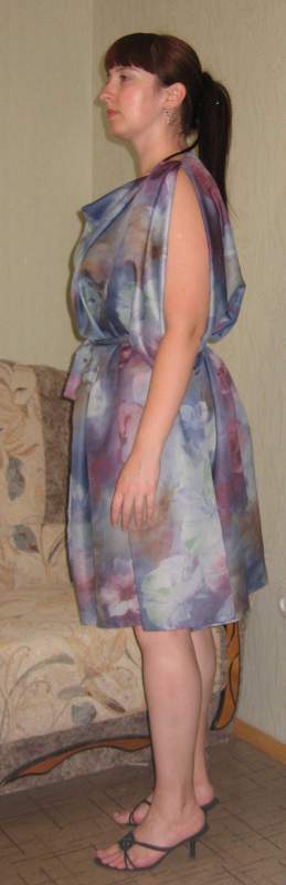 Панночка Опубликовано 31 июля, 2009 Поделиться #196 Опубликовано 31 июля, 2009 Через некоторое время, начитавшись опять же этой темы, мне захотелось сшить платье а-ля хитон. Вот что у меня получилось: Ткань взяла легкую плательную синтетическую (другого не нашла, а у этой рисунок очень понравился). К сожалению она оказалась не очень послушной. На спине "провисание" получалось некрасивое. Я его и так и этак, в итоге пришлось от него совсем отказаться. На спине ткань идет от плеча к плечу горизонтально: Схема платья с размерами готового изделия (мой рост 172 см): Между точками А-В и С-D я сделала по три складки. Исходное расстояние 12 см, стало 4 см. Сзади складок нет. Плечи сшиваются между АВ - А1В1 и CD - C1D1. Тут вроде все просто. Размеры, конечно, подбирались опытным путем :) Сначала платье было и длиннее и шире. Спину я потом сузила минимально. С длиной определилась в последний момент. Спасибо всем вам за вдохновение! Ссылка на сообщение Поделиться на другие сайты Поделиться