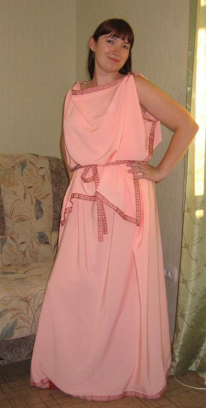 гюго Опубликовано 14 июля, 2009 Поделиться #186 Опубликовано 14 июля, 2009 (изменено) Вот......получился хитон "реактивный", сшился из двух готовых платков 90х90, минут за 30, крой - только наметить место сужения и срезать ткань, боковые швы проложила руками, срезы обработала тоже...цена вопроса 300 рублей, что тоже приятно))Осталось придумать фибулы - пока сколола булавками...Продолжение следует...))) Изменено 14 июля, 2009 пользователем гюго Ссылка на сообщение Поделиться на другие сайты Поделиться