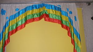 мои шторки для детской из старой льняной простыни , кусочков корейской подкладочной ткани, шились в 1998 г, для поддержки- простой белый плафон для люстры, раскрашен лаком для ногтей - с солнышком и облачками, обозначенными голубыми точками