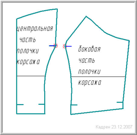 Мы получили выкройку полочки для нижней части корсажа или слоя фонда, состоящую из двух деталей.