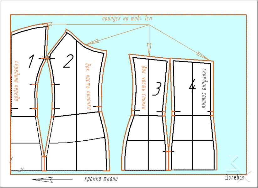 Стоит продумать, где будет застежка, и соответственно положить лекало. Если работа предназначена для себя, то застежку лучше расположить спереди, значит нужно оставить еще припуск для молнии 1см по середине переда. Если изделие предназначено для клиента, то я предпочитаю застежку сзади. Нам будет легче отрисовать модельную линию верха.