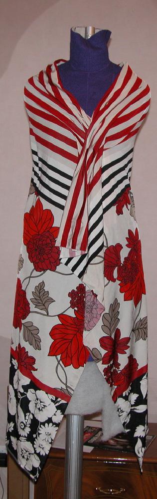 И это же надо было найти такой подходящий купон и так опять же необычно вложить в него непростое платье. Я со своим консервативным умом сказала бы- купон красив и так, ему ничего не надо, кроме как положить как он идет - верх полоска, низ цветы. И делов то! А у вас и складки вписались на боку, и драпировка сверху, и резинка сзади- столько деталей, которые преобразили этот купон и сделали его еще интереснее в этом платье!