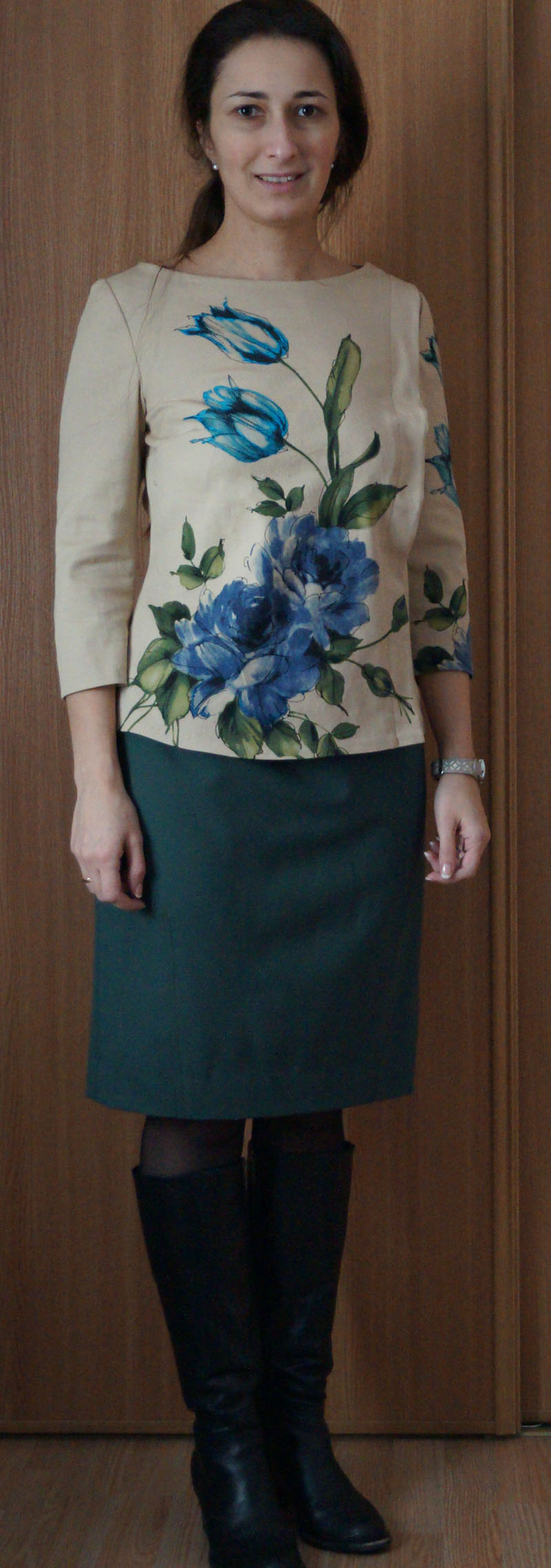 Kundze Опубликовано 6 марта, 2013 Автор Поделиться #1700 Опубликовано 6 марта, 2013 Татьяна Владимировна,спасибо,что проанонсировали.А то я забегалась вся-))Дочери предстоит ряд зарубежных поездок,в том числе стажировка в Оксфорде.Ещё сшила свеженький комплект -юбка из Патронес 309 с вытачками от подола,шерсть с эластаном и кофточка из хлопка с эластаном.По кофточке советовалась выше. Спасибо всем,взяла от всех советов понемножку.-))Юбка,молния и зелень на цветочном мотиве реально одного тона.Что-то на фото юбка бирюзой отдаёт. Давно хотела попробовать всвободноходовую по рисунку на ткани,но как-то не встретила подходящих принтов.А этот отрезок с большой скидкой взяла из-за цветочного мотива.Вот,удовлетворила своё желание,пройдясь редкими стежками(только по тюльпанам и кое-где стебелькам. Ой,и меня сфотографировали.-))Одна из любимых юбок( по выкройке из книги 50-х) Сами то сидим на чемоданах,улетаем в Рим праздновать день рождения мужа-))Ему в нагрузку сшила кашне(одел на работу)такое же сделала и его другу-коллеге Дайнису,рьяному болельщику Рижского Динамо.Вот,с буквами,чтоб не путали.У моего другая буква.Всем знакомый шёлк-)) и тоненькая шерсть цвета Latvian red. Мой революционно настроенный католик вчера всерьёз разрабатывал план проникновения на кардинальский сходняк.Я уже испугалась,не придётся ли шить сутану-))Выручил некто в кроссовках,не сумеевший осуществить этот план вчерашним днём,о чем было прочитано вечером в новостях.-)) Время от времени все же стоит немного отдохнуть от безделья. / Ж. Кокто Ссылка на сообщение Поделиться на другие сайты Поделиться
