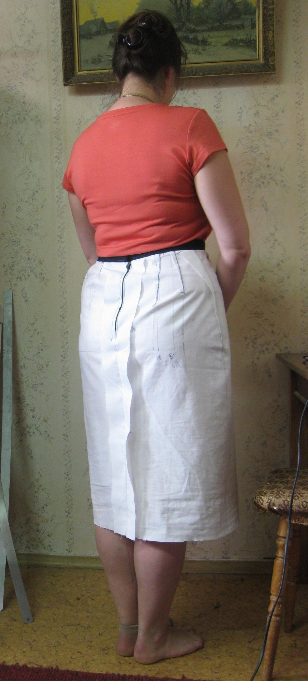 - она (ЛТ) не горизонтальная. Вероятнее всего, на новом пробнике Вам нужно будет слегка приподнять ПРАВЫЙ бок по ЛТ. То есть. Строите симметричную юбку, пришиваете к ней хоро-о-о-ший, нормальный пояс и смотрите, на сколько поднять эту юбку в правом боку ПОД пояс.