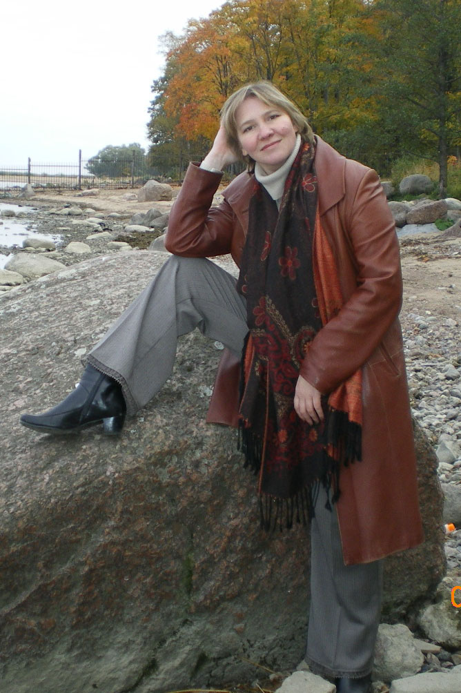 Вот мое фото 7-летней давности. Мне 41 год. Вот так закинуть ногу на валун на уровень головы, в полной осенней экипировке - да легко, мимоходом! (Кстати, и прочие приемы Устиновой налицо: расстегнутый плащ с приподнятым крупным воротом, легко болтающийся объемный шарф. Стрижка здесь слегка отросшая)