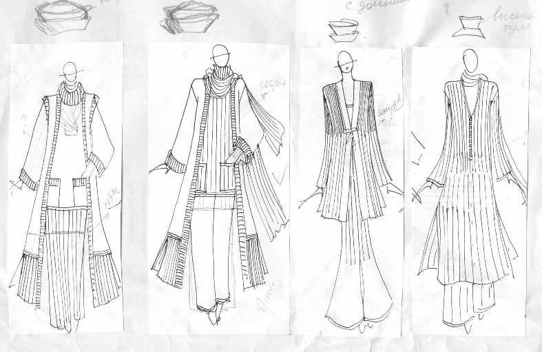 Natamoda Опубликовано 11 февраля, 2008 Поделиться #126 Опубликовано 11 февраля, 2008 (изменено) На эскизах ещё сохранились надписи, на какую манекенщицу делать модель.Достала свои эскизы 80 годов и увидела, что модели достаточно современны и сейчас. (Сейчас же 80-е в моде)Модели с показа - моя гордость. Сделаны на допотопном вязяльном оборудовании без какого либо программного обеспечения. Платья с диагональным рисунком - без боковых швов ( трикотаж вообще швов не любит). Всё это надо было продумать заранее, зная возможности машины, иногда приходилось открывать новые возможности старого оборудования. Точно рассчитать само вязание. Всё это работа художника. Специфика работы с трикотажем - все или почти все конструктивные и декоративные линии должны быть получены за счёт вязания. Даже просто отрезать подол, чтобы укоротить изделие нельзя - край заработан при вязании. Что-то, конечно, можно было исправить кетлёвкой, чем мы и пользовались в выставочных работахСейчас, с развитием компьютерных технологий и нового оборудования, наверное легче это сделать. Изменено 12 февраля, 2008 пользователем Natamoda Мой блог 3Д лекала дистанционно Ссылка на сообщение Поделиться на другие сайты Поделиться