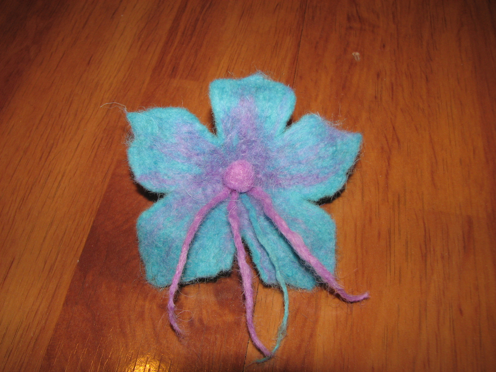 Доброе время суток! Сегодня весь день читала форум. Работы у всех просто восхитительные. Я тоже заразилась валянием. И хочется двигаться дальше. Сделала цветок заколку в подарок подружкиной дочки. Еще был опыт в валянии сумки. Но т.к. у меня не было одинаковой шерстки я ее делала разноцветную. Форма получилась такая, как и задумывалась изначально, но цветовая гамма мне не понравилась, слишком грязные цвета получились.