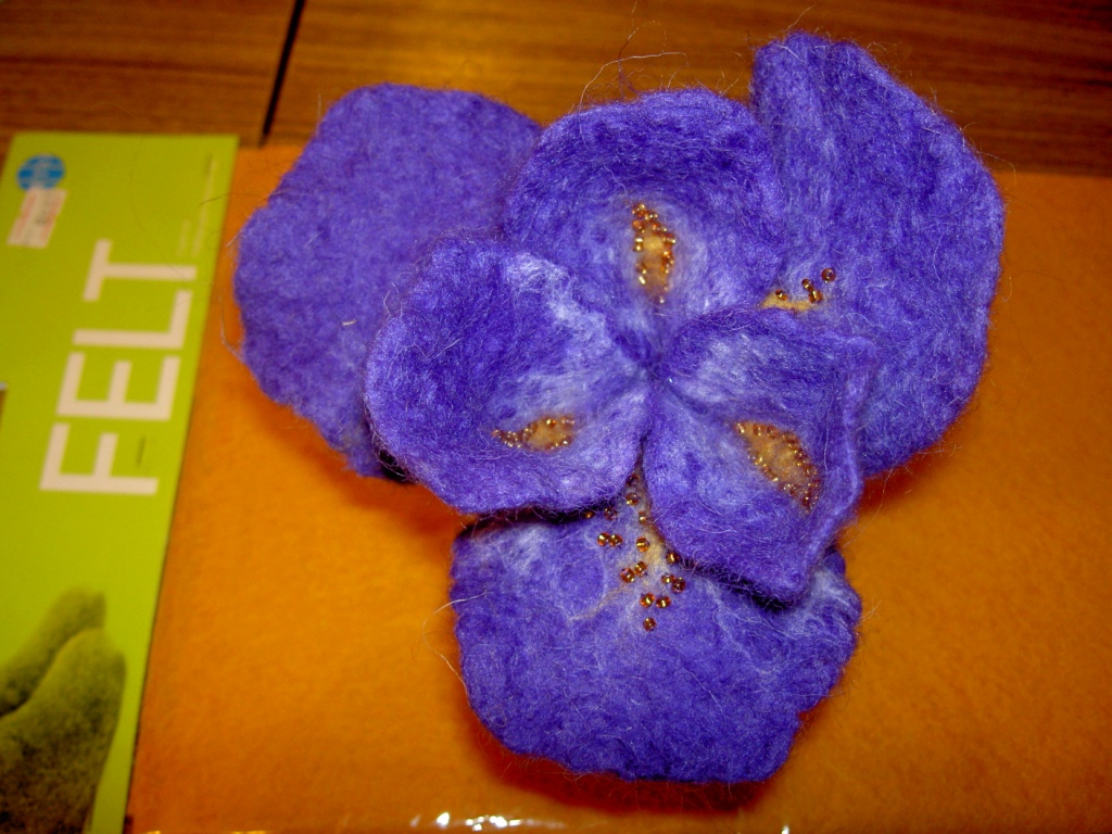 На берет может решусь, шерстки черной у меня нет совсем.Пришлось сегодня купить набор ассорти из-за полного отсутствия черной шерсти,а там её 20гр только.Опять упорно жду посылку заказала черной австралийской 1кг и ещё разной красоты.Перешла к" малым "формам ,пытаюсь свалять ирисы.Окунула заготовки в раствор воды с обрезками водорастворимого флизелина .Лепестки стали держать форму.Это опытный образец.Пушистость и относительная мягкость шерсти не пропала,не хотелось получить картонные цветы.