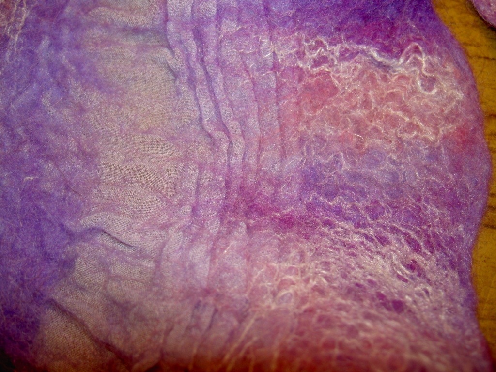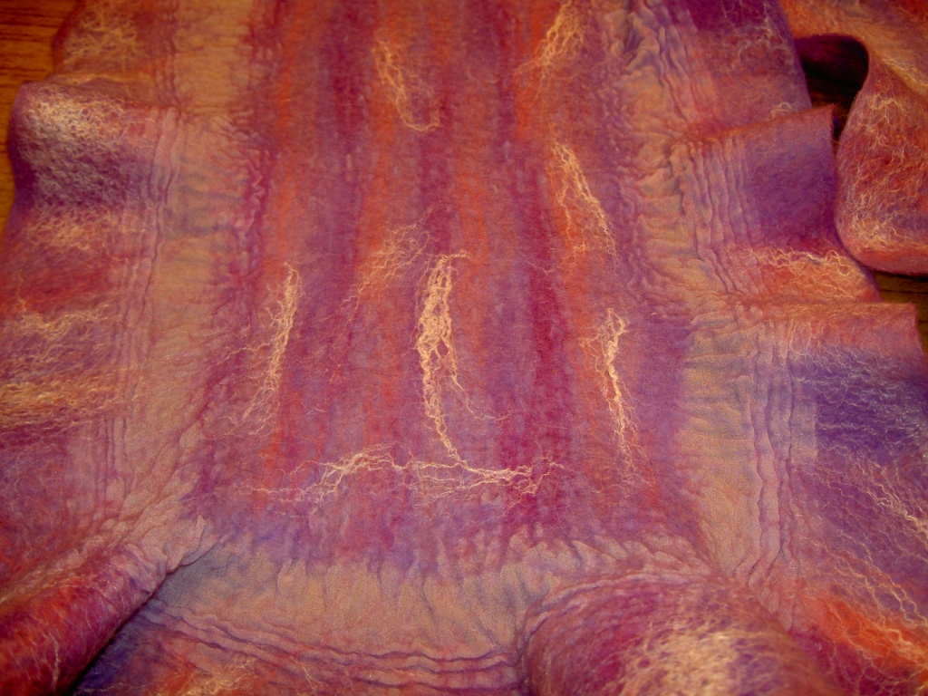 Отчет по мультиколору.Цветопередача плохая ,но снимок делала при комнатном освещении ,лампы у нас теплого спектра ,на фото появилась краснота.Валяла на обычный шифон синтетический. Попробовала сверху немного шелка положить.Все увалялось быстро без проблем.На верблюжью шерсть сил не хватило