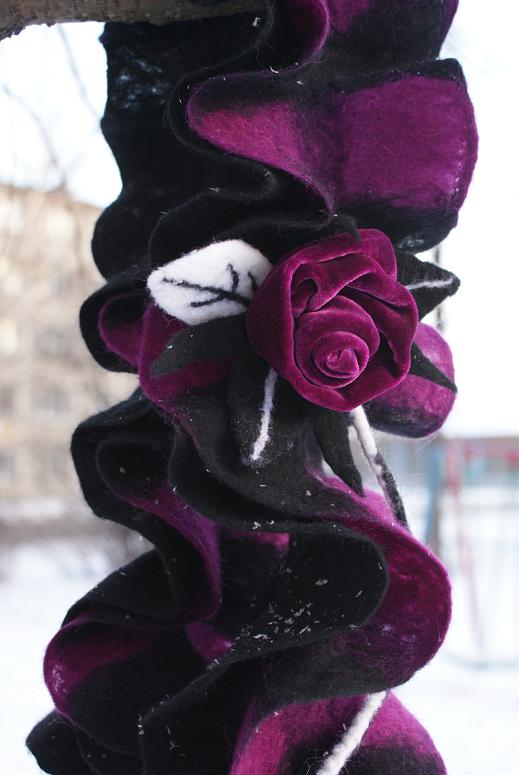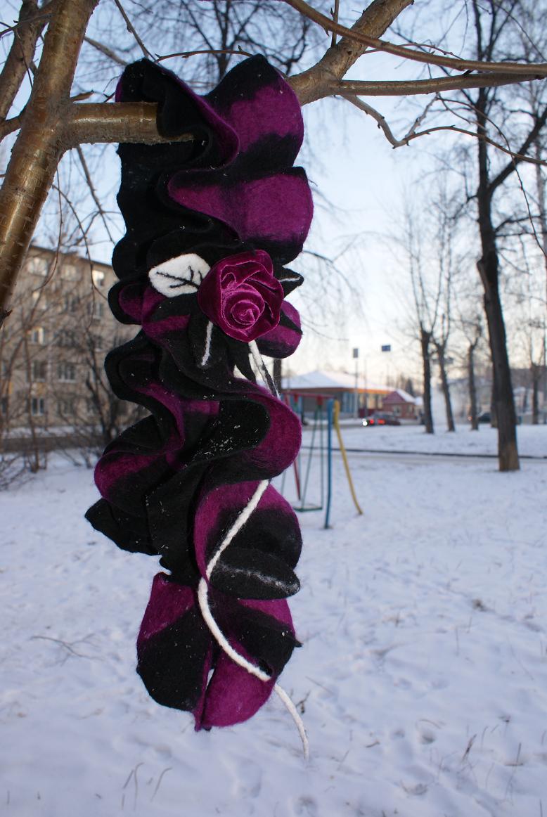 Девочки, а у меня запасы шерстки заканчиваются , подкосил их Новый Год ! А валять-то хотцца! Вот и извращаюсь- сваляла ... опять шарфик из черной тонкой Троицкой и полутонкой . Как сказала Хельга - валяние шарфика- дело проходное - "О, Боже, еще один!", но за неимением шерсти- и он сойдет :))))