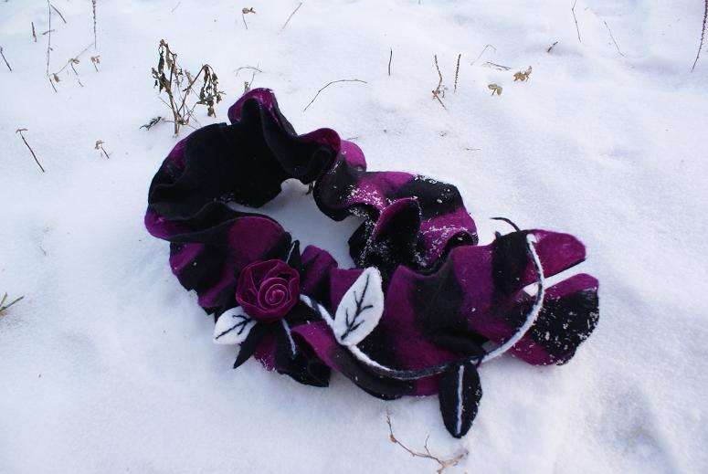 Вот он- остаточный-вредный-зловещий шарфик ГИНГЕМА - первый из серии "Гламурные Ведьмы" . Длина 92 см, брошь съемная, можно носить как браслет на руке, как украшение на шею- она из шелкового бархата, листики из самодельно префельта.