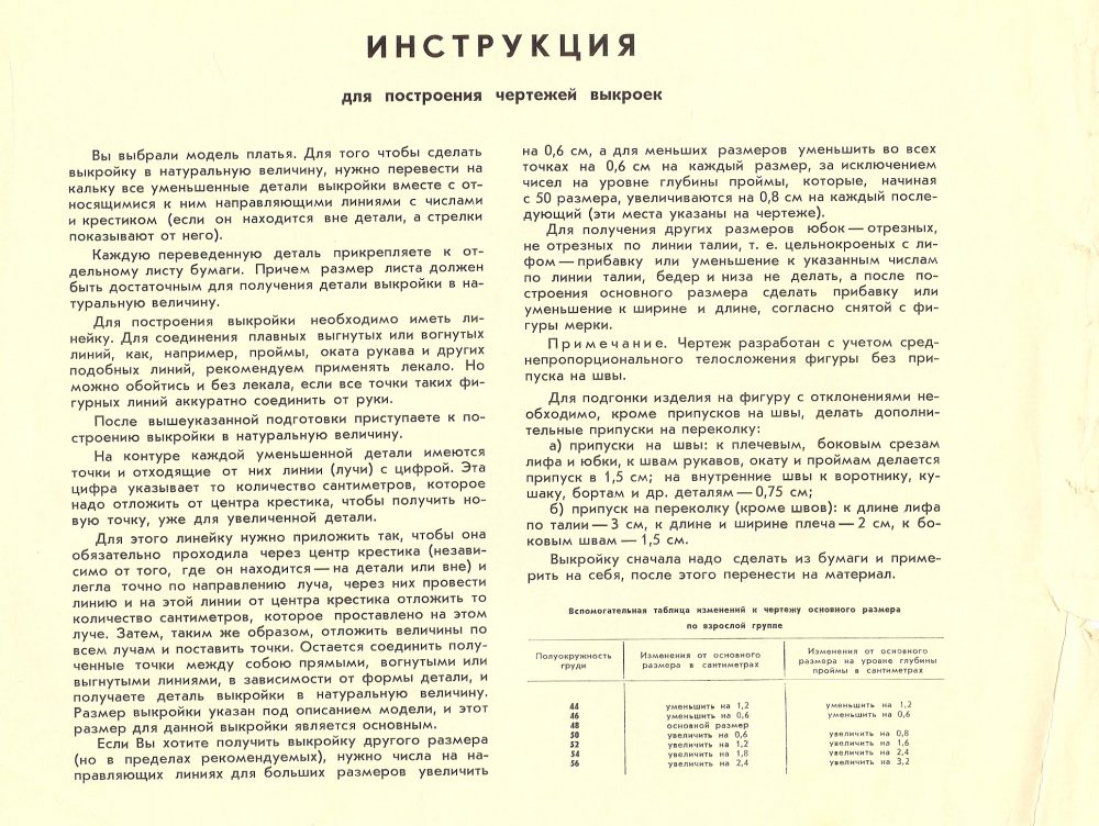 Бурлакова Фрося Опубликовано 2 апреля, 2011 Поделиться #409 Опубликовано 2 апреля, 2011 .Марита123, отвечаю про размеры.Размеры в советских журналах, буклетах итд. определялись по половине мерки Окружности груди II.Скажем, ОГ у вас 96 - это 48 размер.ОГ = 84, это 42 размер.ОГ = 120, это 60 размер. Итд.============================== Бурдовские размеры, которые часто используются сейчас и в журналах типа ШиК - это ОГ:2 - 6. Скажем, ОГ у вас 96. Советский размер будет 48. Бурдовский 48 - 6 = 42.===================================== Поэтому разделите свою ОГ пополам, и вы получите свой размер того времени. На него и ориентируйтесь в выкройках 50-60-70-80 гг.Кс, бурдовские выкройки 50-х гг. имели такой же размер, как и советские. На "минус 6" они перешли где-то в 60-х. Всегда всех стройней, розовее и вышеРучное шитьё в режиме онлайн Ссылка на сообщение Поделиться на другие сайты Поделиться