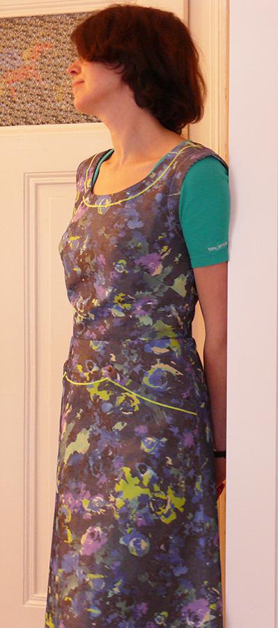 Первый раз шила модель 50х со спущенной линией плеча ( на мне этот эффект смазался из-за собств. прямых плеч). Юбку укоротила, как мне нравится. Про отстрочку писала выше, мои машинки сопротивлялись, шила одной катушкой, а нитку переплетала рукой в процессе шитья, делая огромные воздушные петли.