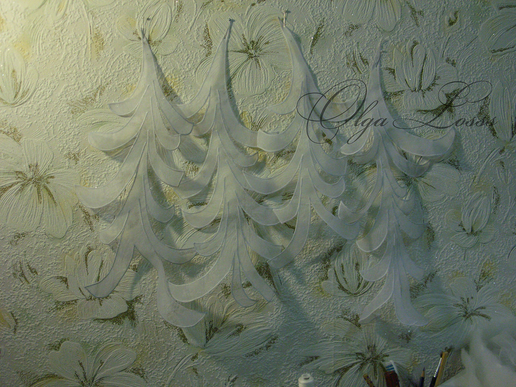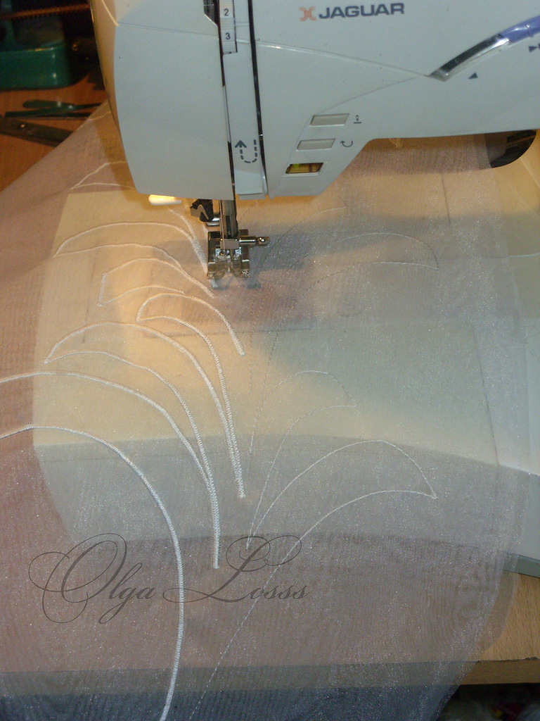 И изготовление декора: это аппликация из органзы, но она не пришита к платью по всему периметру, а только прихвачена бисерными линиями. Делалось всё по эскизу на бумаге, затем рисунок переводился на ткань и обстрачивался на швейной машинке "зигзагом".