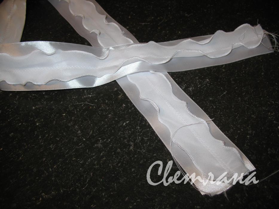 Рюши делала из атласной ленты шириной 4см, а поверх шифоновая полоса(по косой)...
